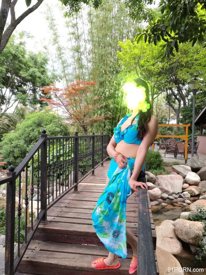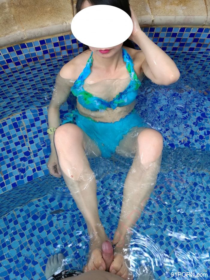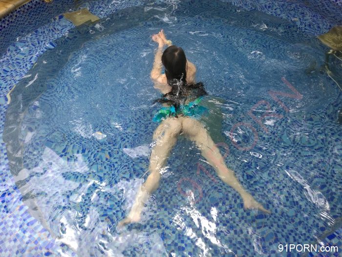 不行,咱要反客为主,该我来玩了。我让她带的泳衣是单独有一块长纱的,可以批、可以系,我就让他斜着系在腰上,在后面打结,然后悄悄把泳裤拔了下来,这样即使有人突然闯入,长纱一拉,然后坐在池子里,哈,还是安全的。这不,装扮玩了我就让她转身了,哇呀呀,很吸引眼球噢